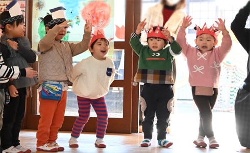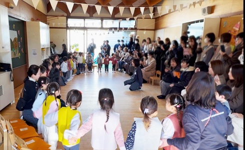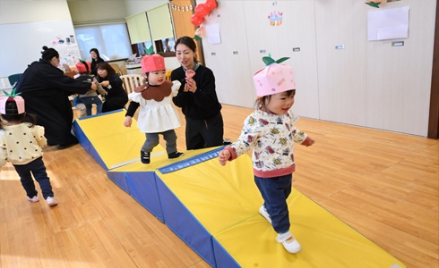 赤組(3歳児、満3歳)、ももの2組(2歳児)、ももの1組(1歳児)の学年末参観日